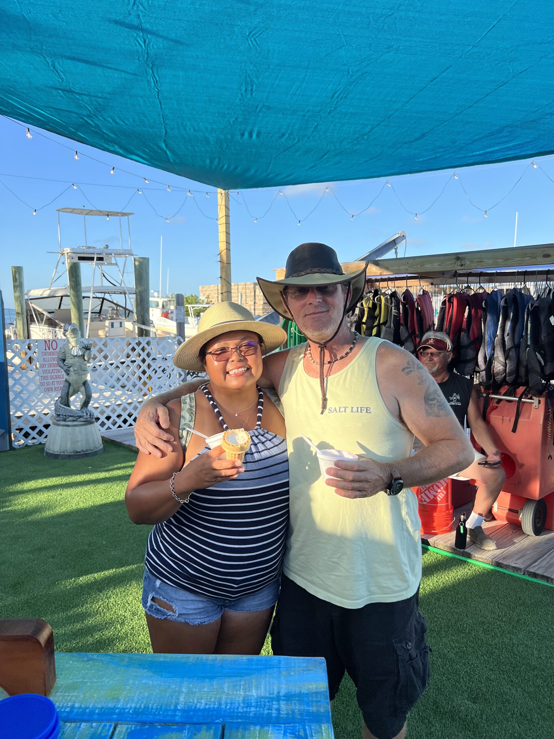 Dockside seating, ice, cold, beer, and wine Greek Mexican, Italian seafood, fried baskets, grilled entrées taste for everyone.